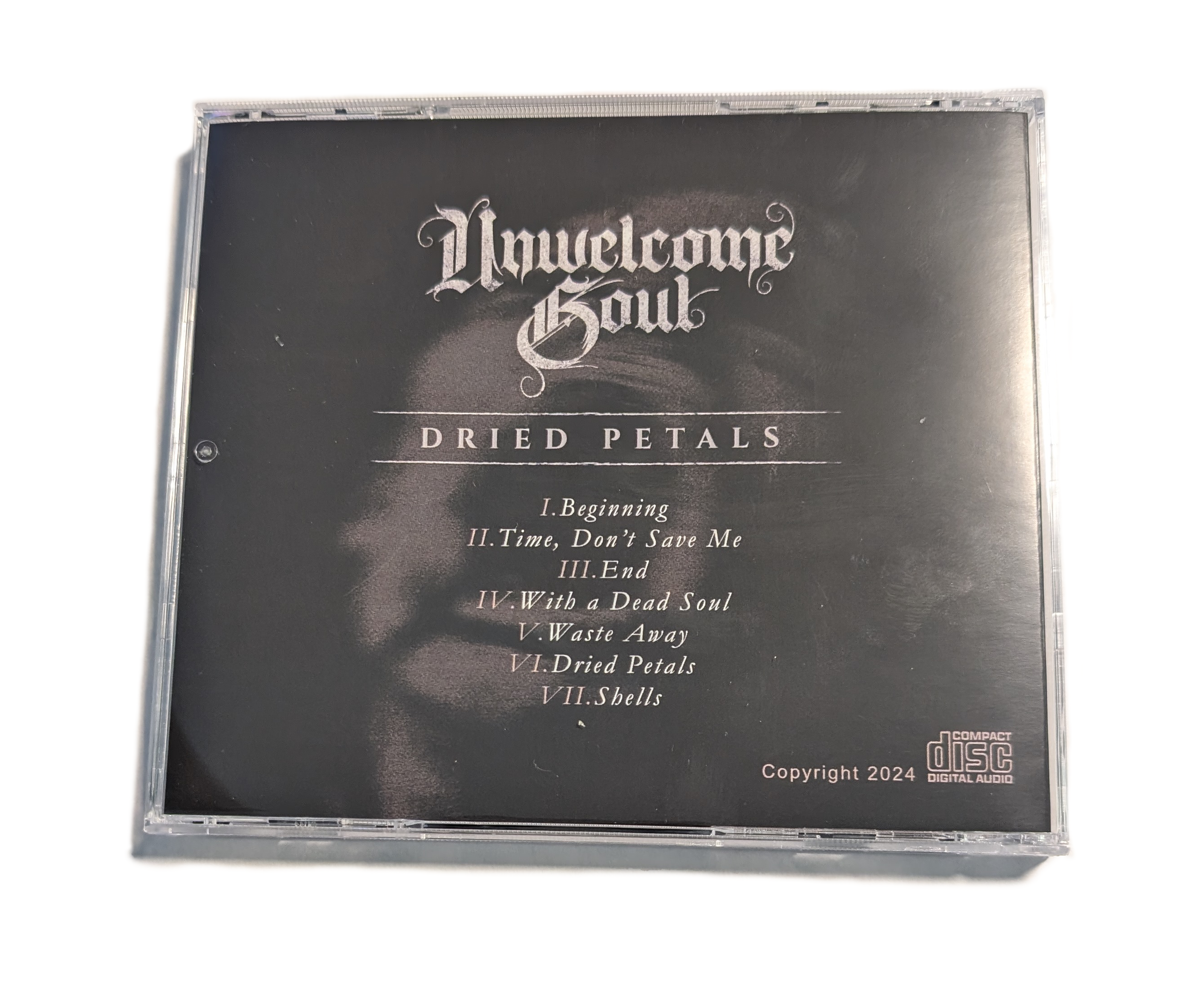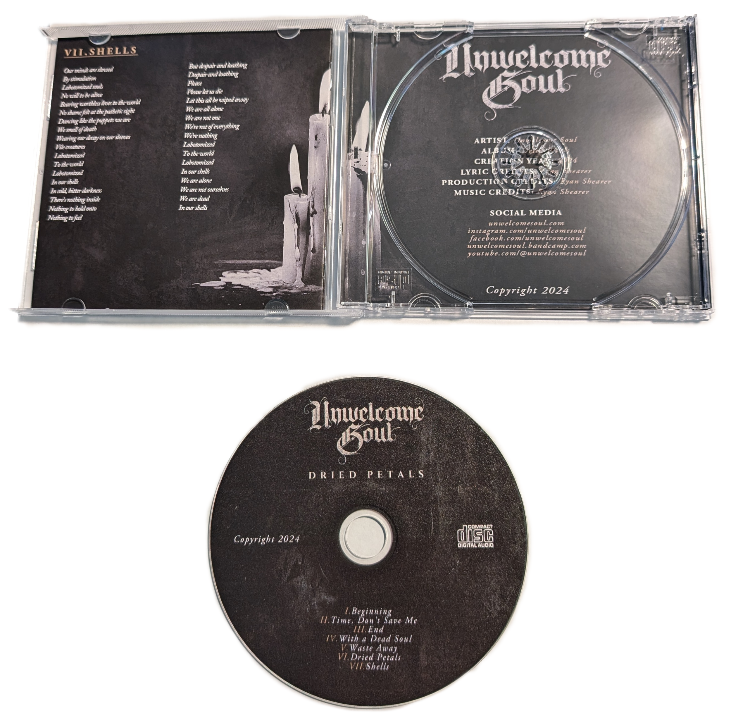 Physical copies of the Dried Petals album (limited run compact discs) are now available for purchase at unwelcomesoul.bandcamp.com ! If you would like to support Unwelcome Soul, buying one of the CDs is a great way to do it! Anything you purchase goes to support the artist. T-shirts will be available soon at the same site! Much gratitude to you for visiting.